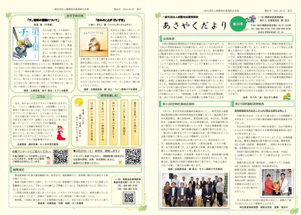 朝霞地区薬剤師会では、季刊誌「あさやくだより」を発行しています。ぜひご覧ください。次号は、令和8年1月発行予定です。